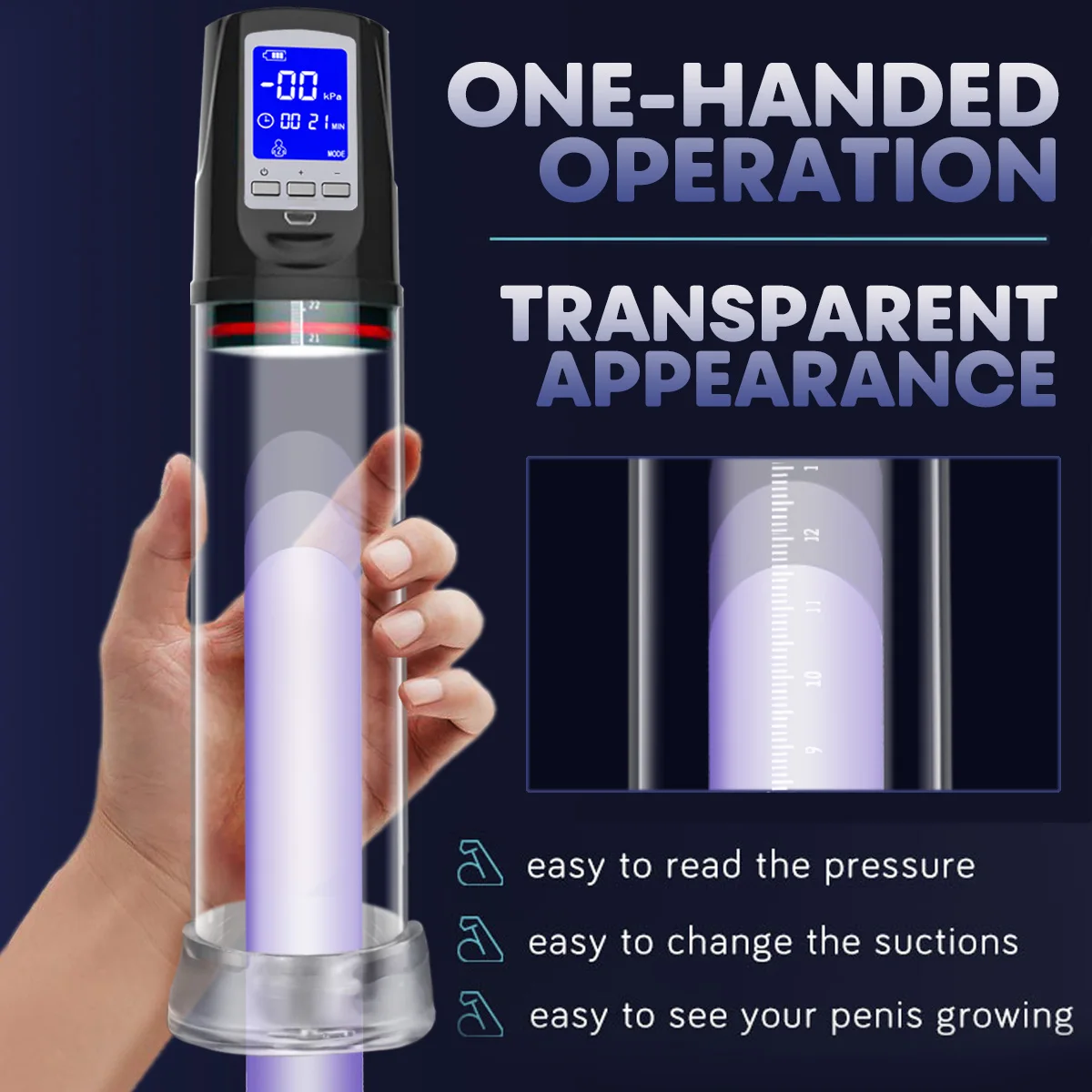 ●Automatic penis pump with transparent cylinder and LCD display to track your progress.