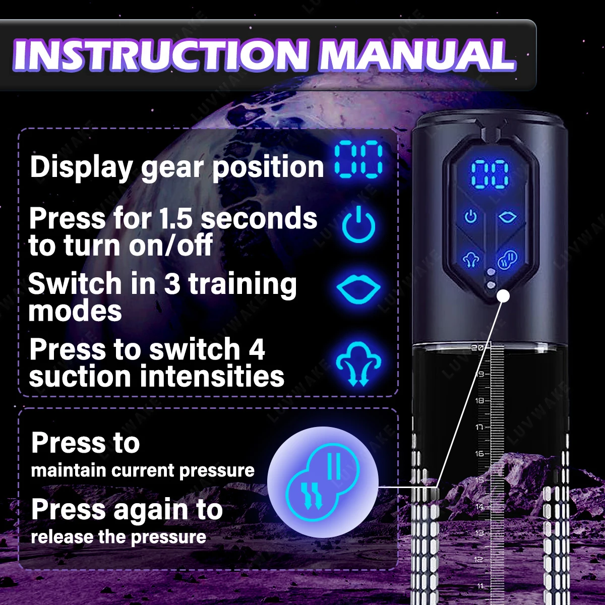 ● Choose from 4 suction and pressure hold levels, along with 3 cycle training levels, for a safer and simpler experience with one-click deflation.