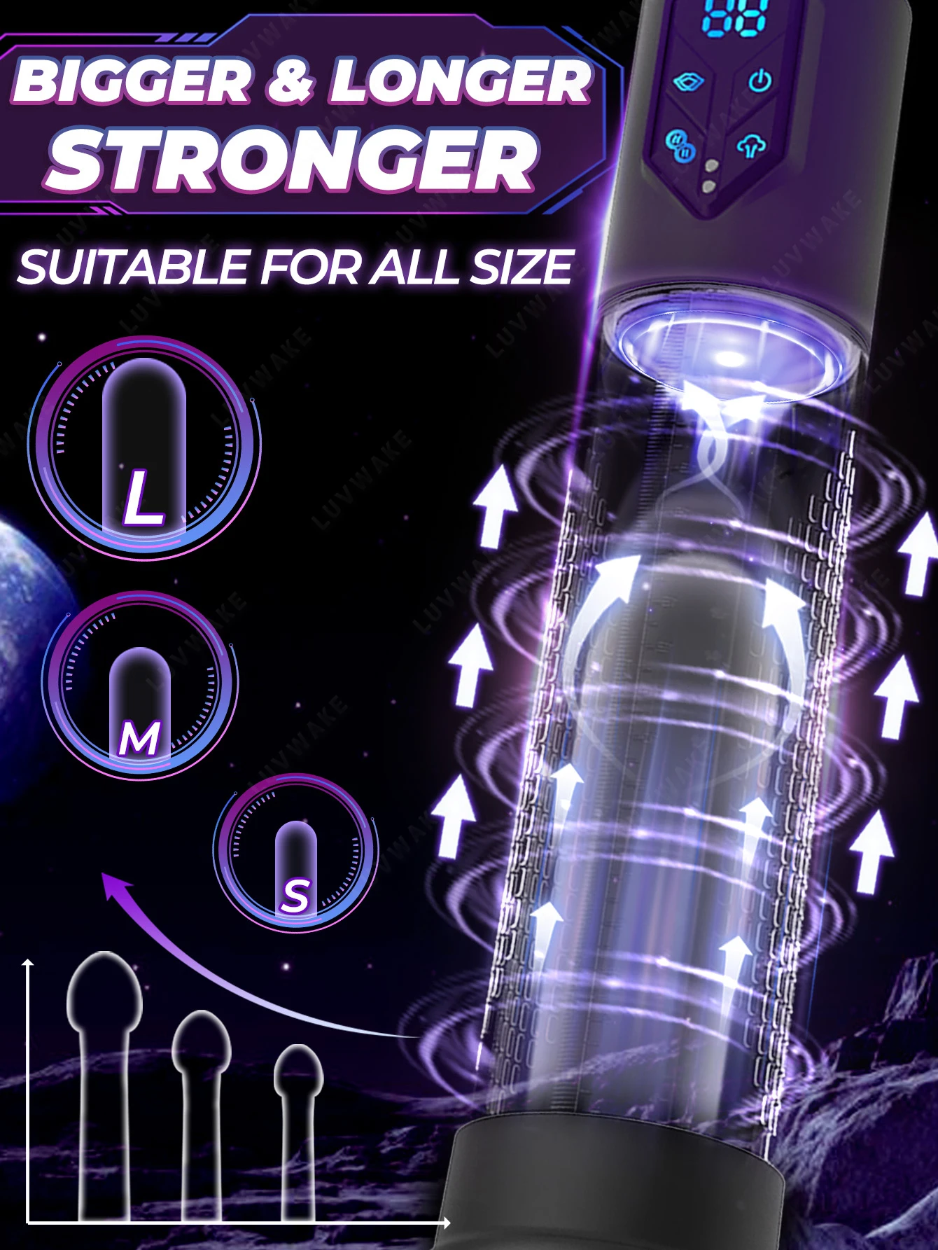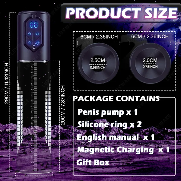 4 different suction intensities: the pumps have 4 selectable suction levels, including a constant pressure mode with 1-3 levels and the intelligent suction mode with 3 levels. After you turn on this men’s sex toy, you can select the desired training mode for enlargement by touching the LCD display.