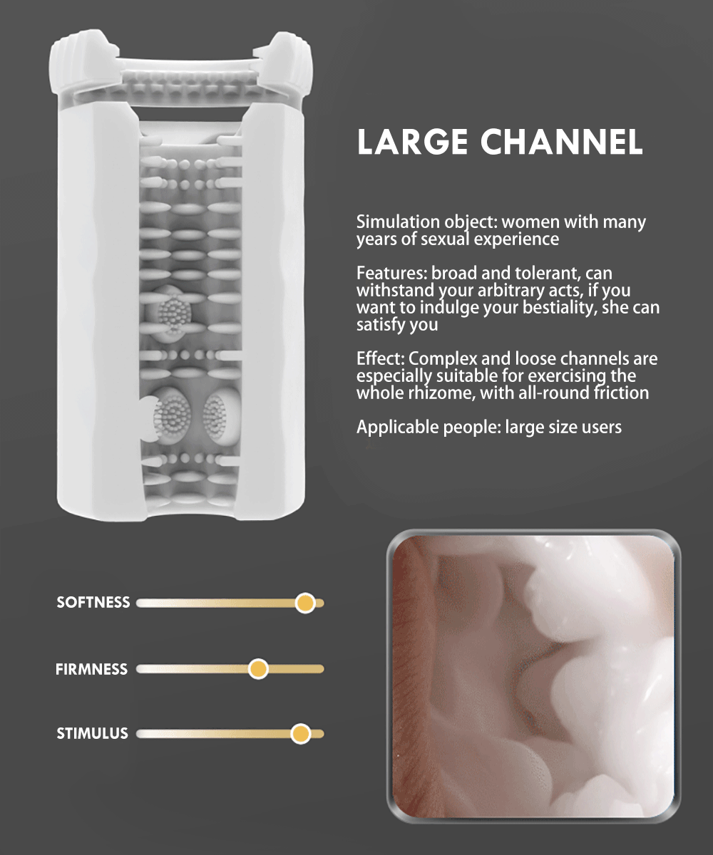 3. Large channel: wide and tolerant, complex and loose channel, especially suitable for exercising the whole root body, all-round friction. [Suitable for the crowd: large size users]