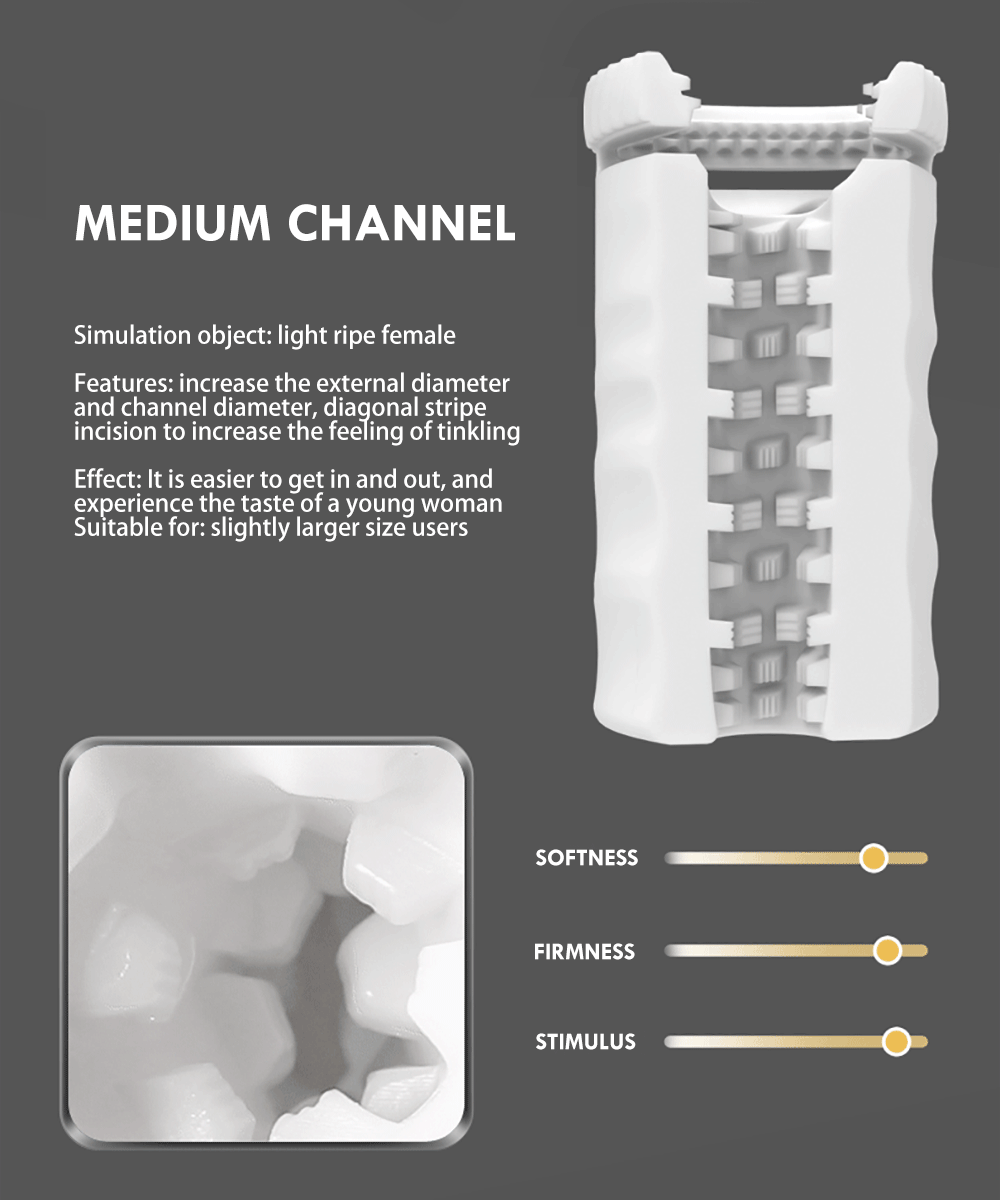 2. Medium channel: increase the outer diameter and channel diameter, and the oblique stripe incision increases the layering of the penis. [Suitable for the crowd: slightly larger size users]